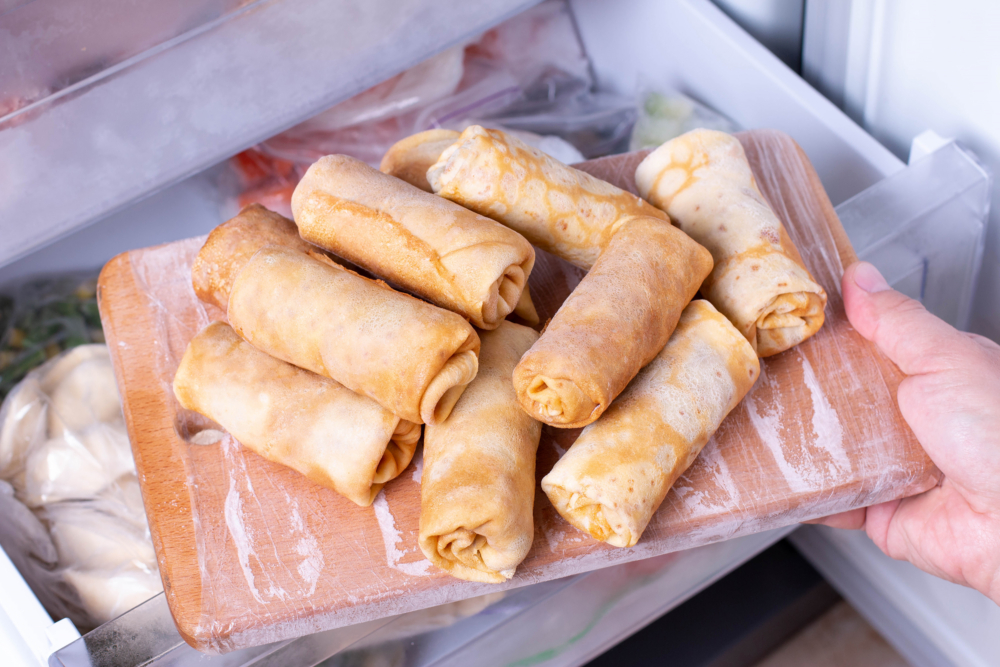 Итак, фаршированные блины перед заморозкой нужно охладить в холодильнике. Разделочную доску затянуть пищевой пленкой и выложить на неё блины, оставляя немного места между изделиями. Если доску пленкой не обернуть, то блины во время заморозки прилипнут к доске. Отправить блины в холодильник примерно на 2 часа. Далее переместить доску с блинами в морозильную камеру на ровную поверхность, минимум на 4 часа при температуре -18 градусов.