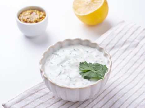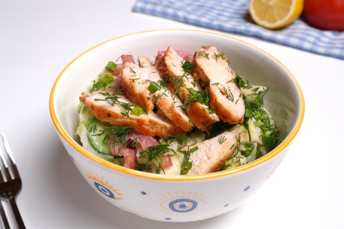 Пестрый салат с заправкой из йогурта и кинзы