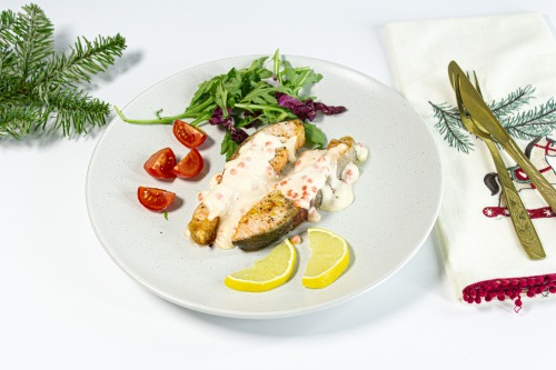 Запечённое филе остаётся сочным и нежным, а сливочный соус с красной икрой делает вкус мягким, насыщенным и «ресторанным», без лишней сложности.
