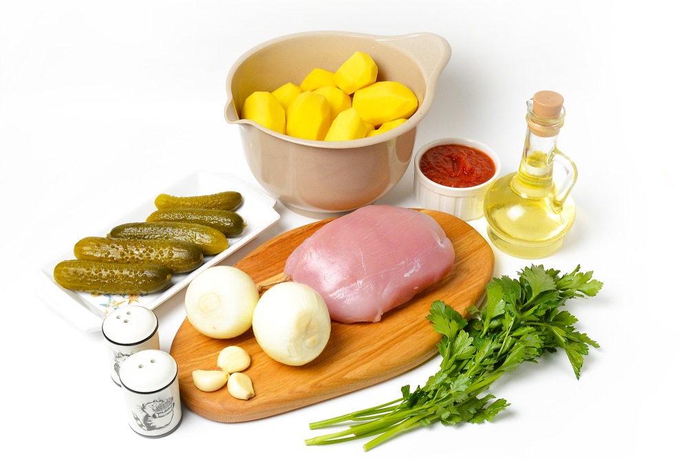 Нежное мясо индейки отлично сочетается с картофелем, томатным соусом и пикантностью огурчиков. А чеснок и петрушка лишь преумножают приятные вкусы. Кстати, традиционно принято использовать соленые бочковые огурцы. Но я, если честно, не очень их люблю и в погребе предпочитаю иметь только маринованные огурчики с добавлением листьев хрена и смородины. Поэтому готовить буду с ними.