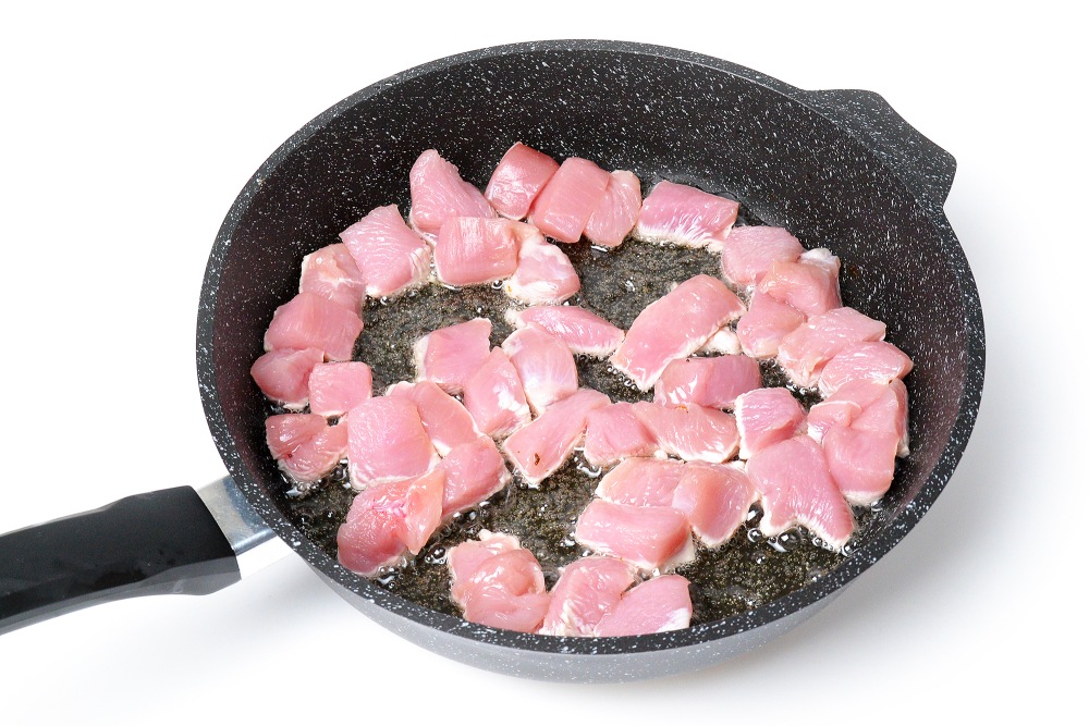 Добавить масло, чтобы оно закрыло дно, и нагреть 2-3 минуты на сильном огне. Выложить индейку и жарить на огне чуть ниже максимального 4 минуты (5/6 для электроплиты).