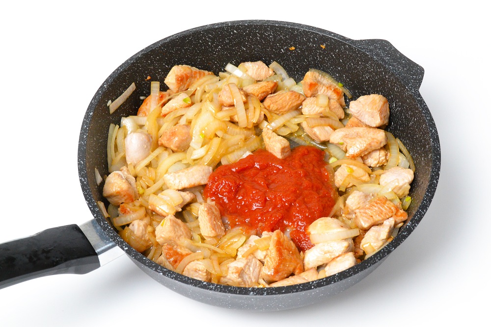 Раздвинуть мясо с луком и выложить в центр томатную пасту. Обжаривать 2-3 минуты.