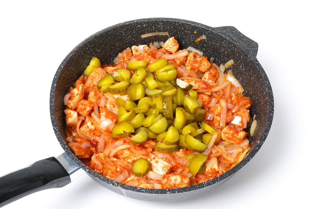 Огурцы берите по вкусу: маринованные, соленые, подойдут и корнишоны. А вот картофель лучше использовать тот, который хорошо держит форму при обжаривании. Например, для этого подходит большинство красных сортов.