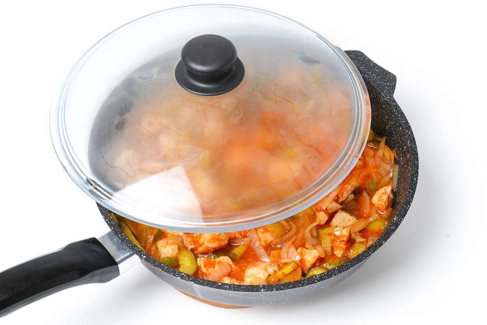 Накрыть крышкой и тушить на среднем огне 15 минут, перемешав 1-2 раза во время приготовления.