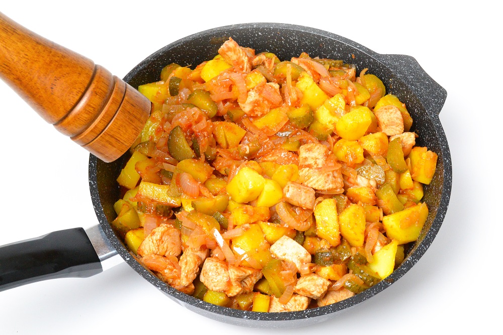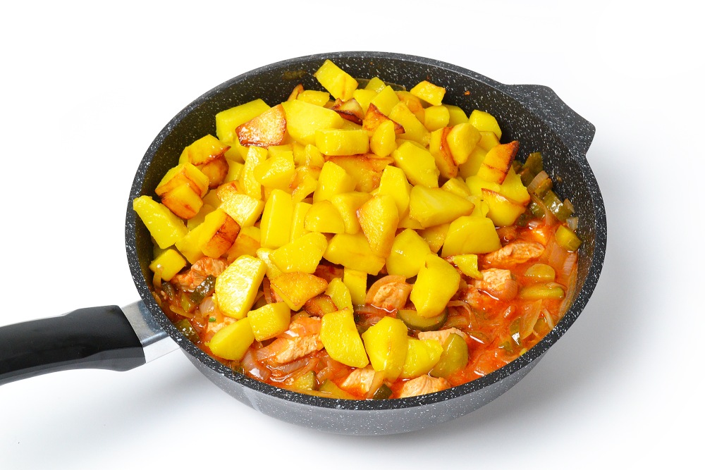 - Не оставляйте мясо и картофель во время жарки без присмотра надолго, чтобы не подгорело.