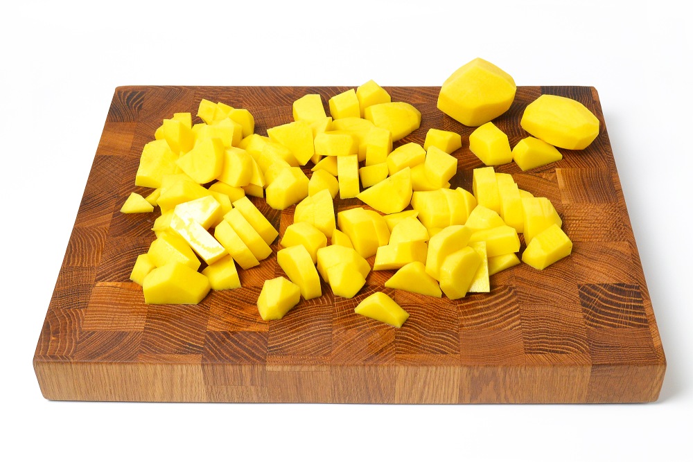Картофель нарезать кусочками толщиной примерно 1 см.