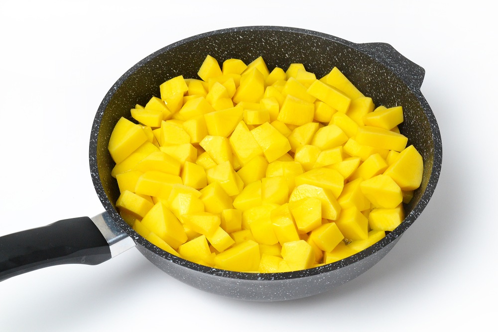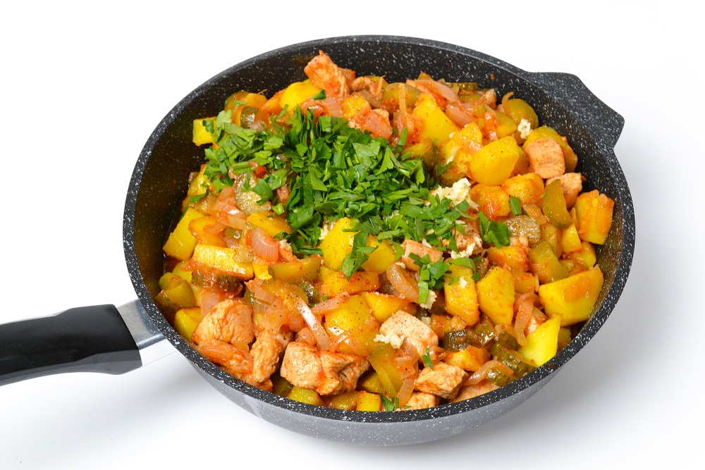 Для указанного количества ингредиентов следует взять сковороду диаметром не менее 28 см. Также можно использовать глубокую жаровню объемом 3-4 л. В нее, в целом, войдет даже двойная порция. Но картофель и мясо в таком случае лучше обжаривать в 2 захода.