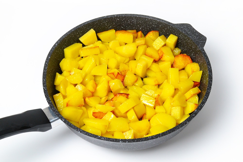 - Кладите картофель и мясо на хорошо разогретую сковородку с маслом и не трогайте их хотя бы 4-5 минут. Если нагревать их постепенно, то корочки не получится, а мясо потеряет сок и станет суше.