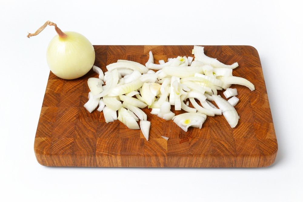 Пока жарится картофель, нарезать четверть кольцами лук.