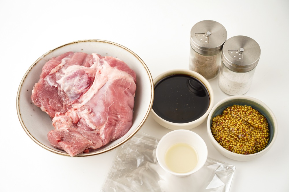 Подготовить ингредиенты. Такой способ готовки подойдет для любых частей индейки и даже можно запечь целую. Я буду использовать бедро на кости. Проверить индейку, она должна быть свежей, без лишнего запаха и влаги. Если используется замороженная часть, заранее переложить её из морозилки в холодильник и дать полностью разморозиться. Подготовить специи, горчицу, масло, соевый соус и рукав для запекания.