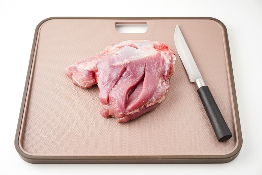 Тщательно промыть мясо под проточной водой, убрать возможные кусочки плёнок. Обсушить бумажными полотенцами. Обрезать лишний жир. Сделать несколько неглубоких надрезов на самой мясистой части, это поможет маринаду быстрее пропитать волокна и сократить время приготовления.