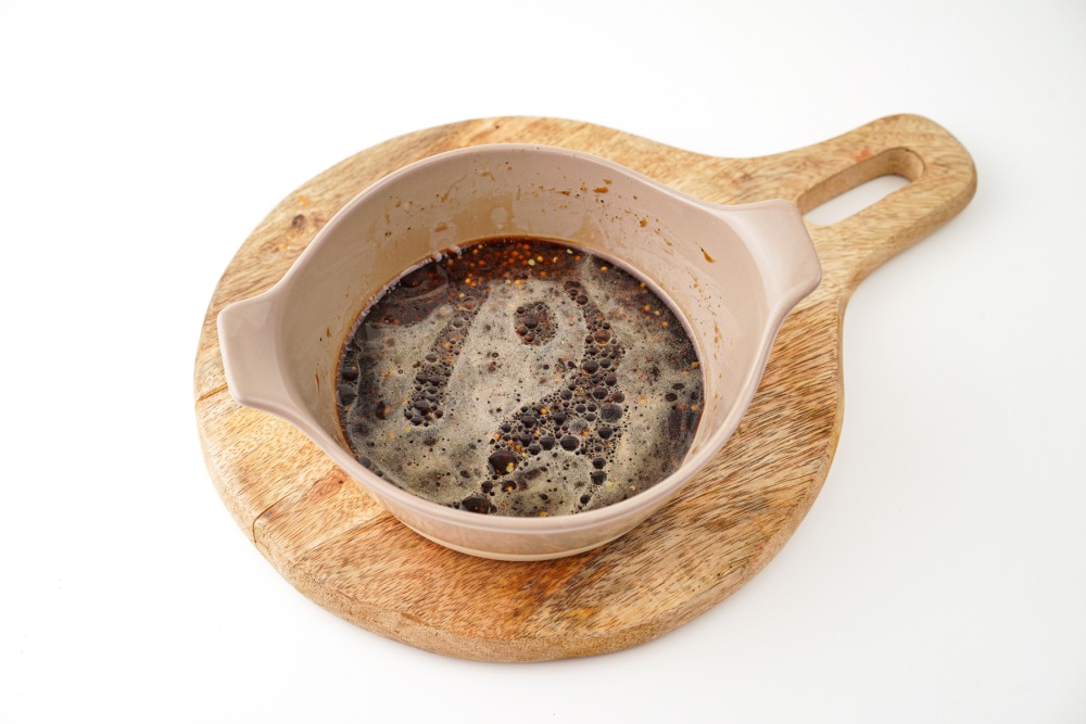 В миске соединить растительное масло, горчицу, соевый соус, соль и перец. Хорошо перемешать вилкой или венчиком, чтобы получилась однородная смесь. Проверить вкус маринада, он должен быть слегка солоноватым, с пикантным ароматом горчицы.