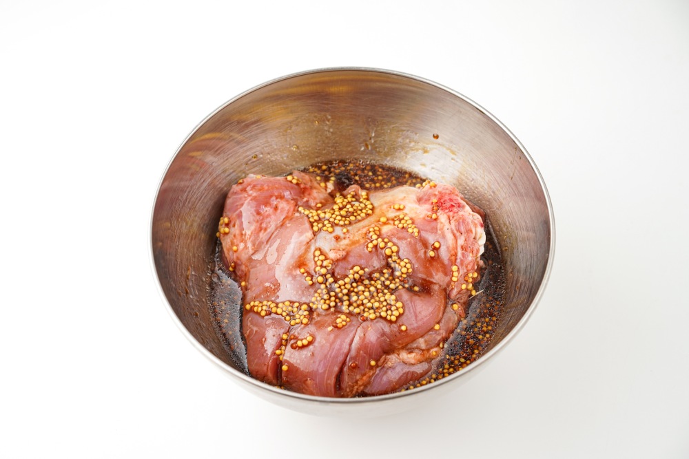 Опустить бедро в глубокую миску. Полить его маринадом и тщательно распределить смесь по всей поверхности руками или ложкой, стараясь втереть её и в надрезы. Несколько раз перевернуть мясо, чтобы маринад покрыл индейку полностью.