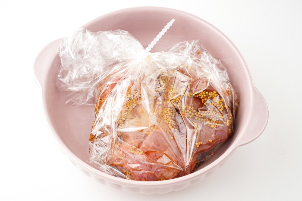 Взять форму для запекания и положить в неё рукав. Аккуратно выложить внутрь замаринованное бедро. Вылить оставшийся в миске маринад прямо сверху, чтобы он стекал по мясу. Завязать рукав завязками, оставив немного места внутри для воздуха - так рукав не лопнет при запекании.