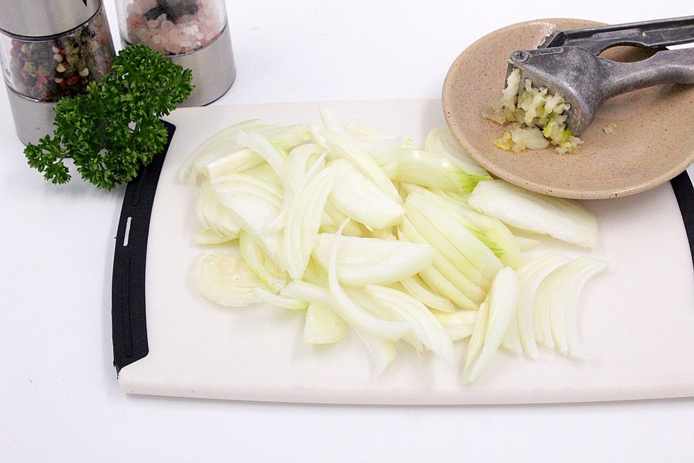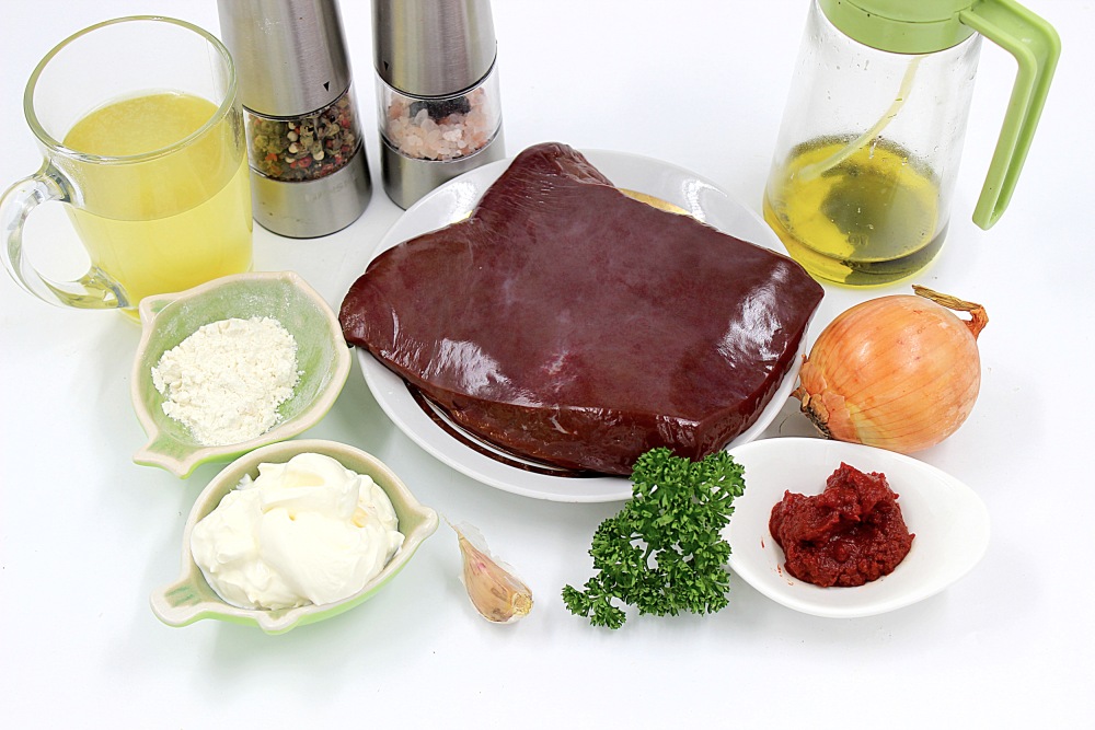 Подготовить все ингредиенты для бефстроганова из печени со сметаной на сковороде.