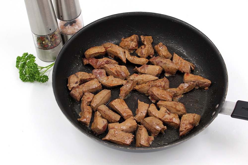- Если есть время, то нарезанную печенку можно замочить на пару часов в молоке. Это смягчит её вкус.