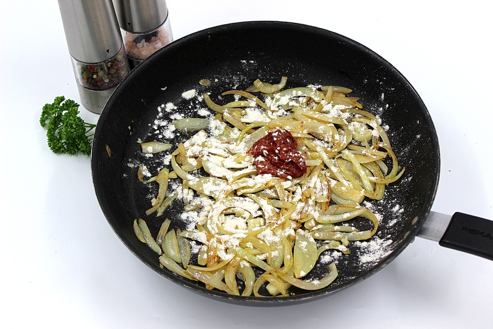 Присыпать поверху лук мукой, добавить чеснок и томатную пасту.