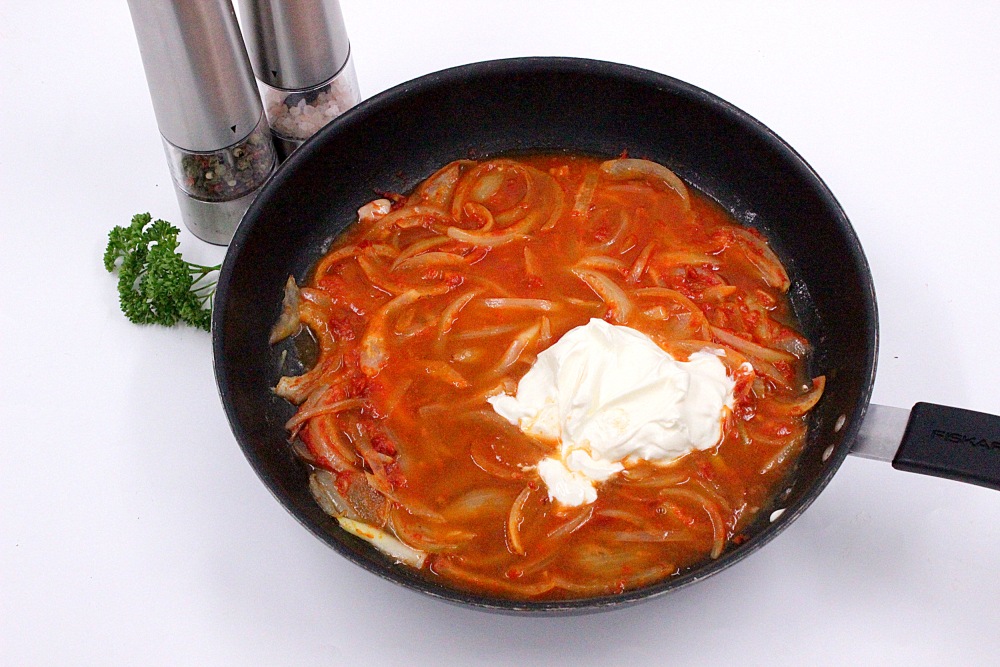 На самом деле очень быстрое и простое блюдо. В то же время оно довольно пикантное и насыщенное. К сметанному соусу практически всегда добавляю томат. Это может быть паста, просто помидоры, томатный соус или даже сок. На мой взгляд, именно эта добавка придаёт интересную пикантность и, неоспоримо, красивый цвет.