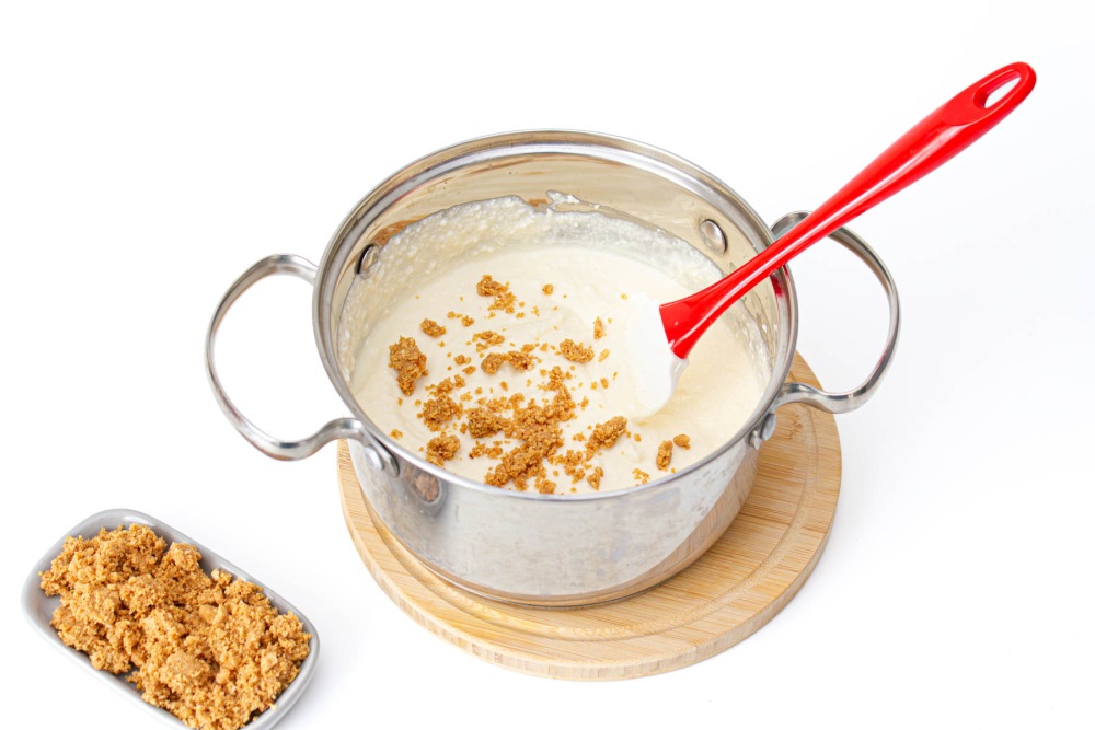 Добавить сгущенку и тоже хорошо все перемешать для равномерного распределения.