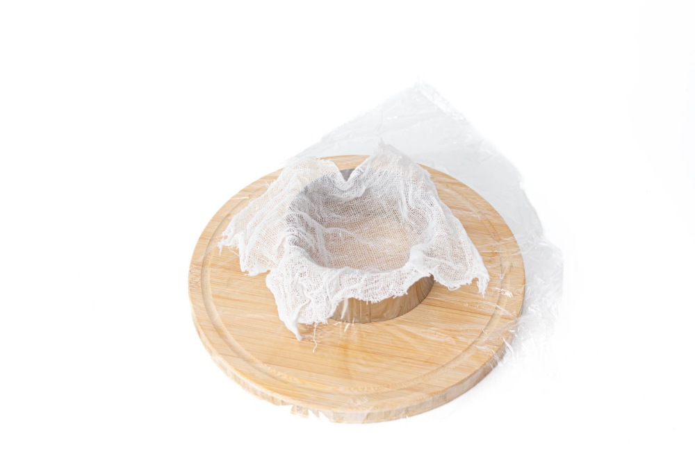 Форму (здесь кольцо размером 9х4) застелить влажной марлей, сложенной вдвое.