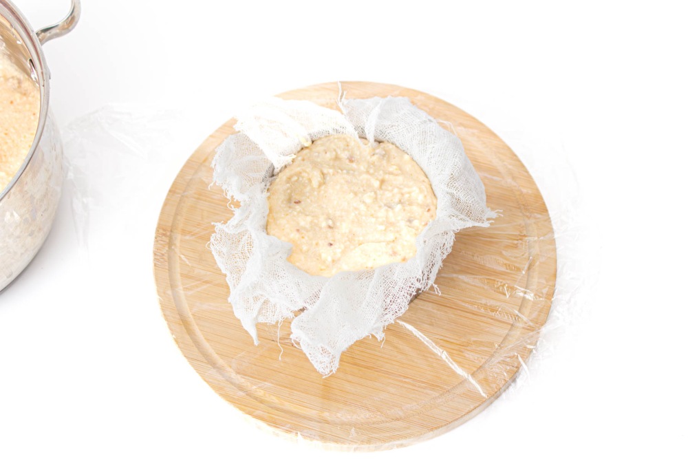Кольцо наполнить при помощи ложки творожной массой. Поднять концы марли.