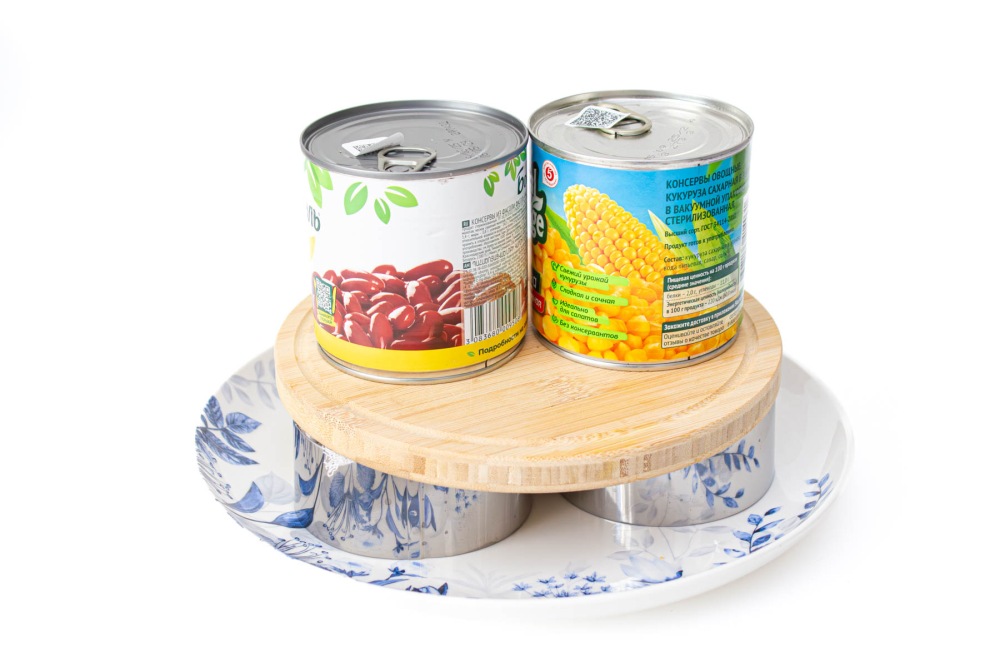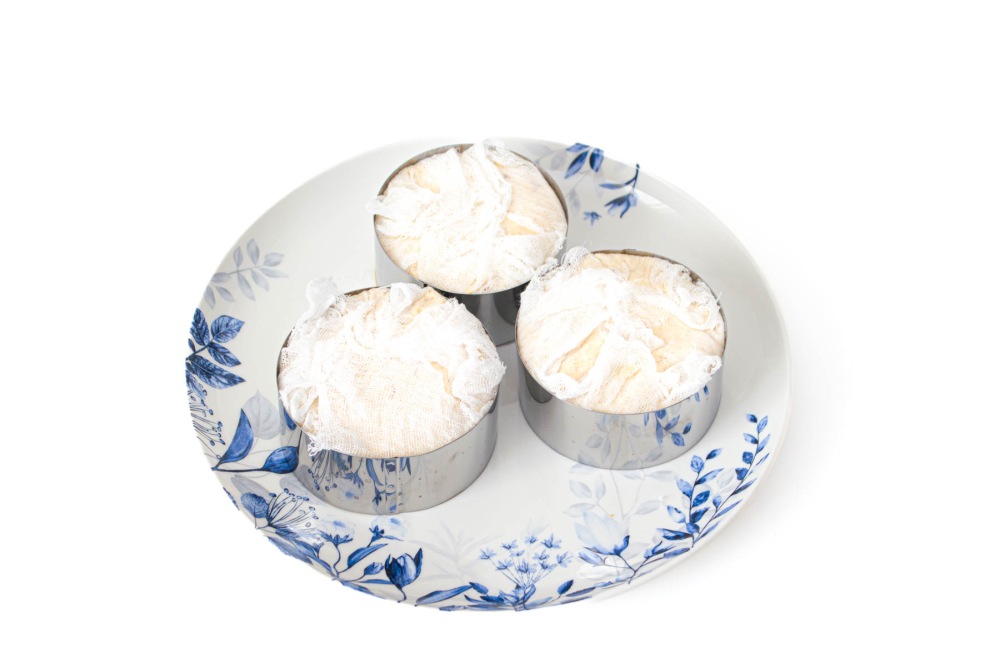 Сверху форм положить доску или тарелку и поставить груз. Я использовала две консервные банки. Убрать в холодильник примерно на 10-12 часов. Лишняя жидкость должна стечь, а масса принять форму кольца.