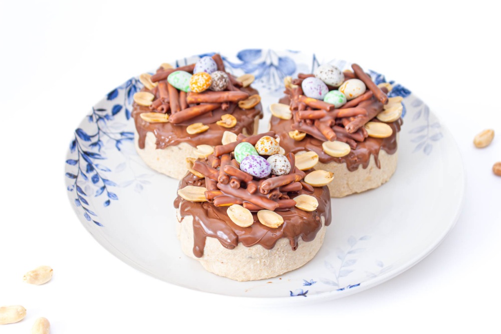 В оставшийся растопленный шоколад добавить сладкую соломку (или наломать песочные печенья), перемешать и выложить на пергамент в форме гнезда. Положить арахис в шоколаде в гнездо и отправить в холодильник для фиксации. (Это по желанию). Декор полностью Ваша фантазия.