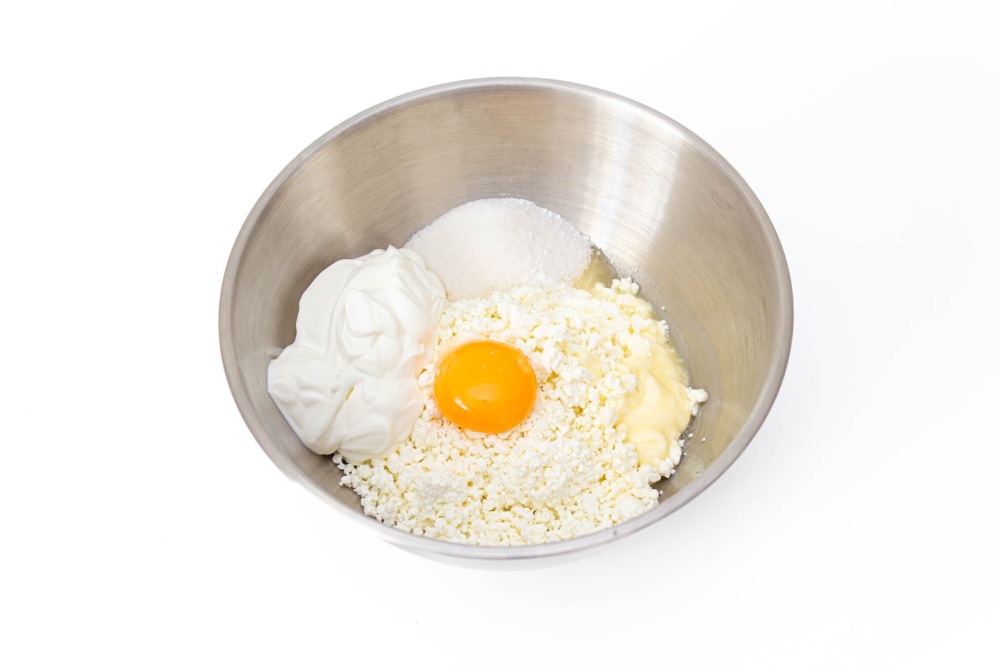 Соединить творог, сметану, желток, сахар, ванили и соль.