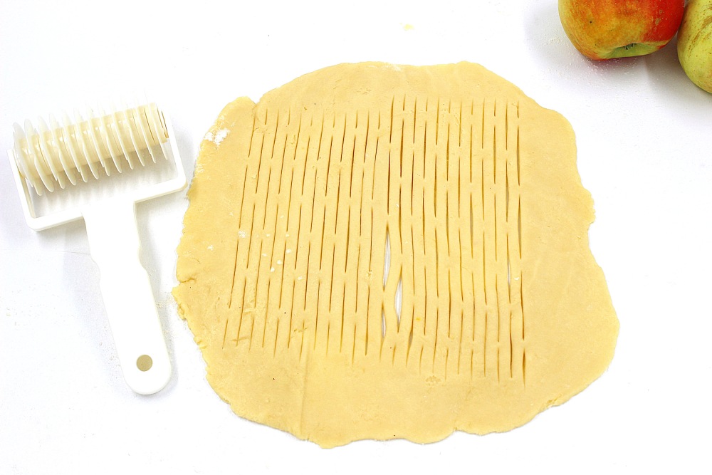 Раскатать оставшееся тесто в тонкий пласт и нарезать в виде решетки с помощью спец ролика-резака.