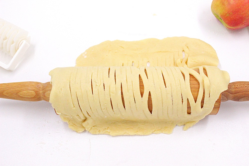 Раскатать оставшееся тесто в тонкий пласт и нарезать в виде решетки, с помощью спец ролика-резака.