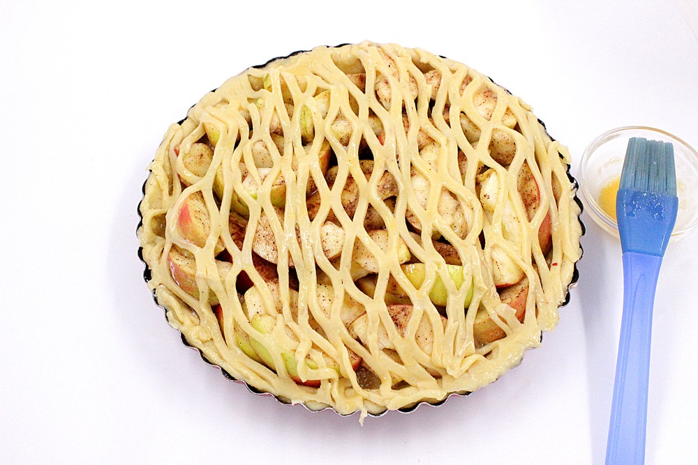 Накрыть пирог решеткой из теста. Смазать яйцом.