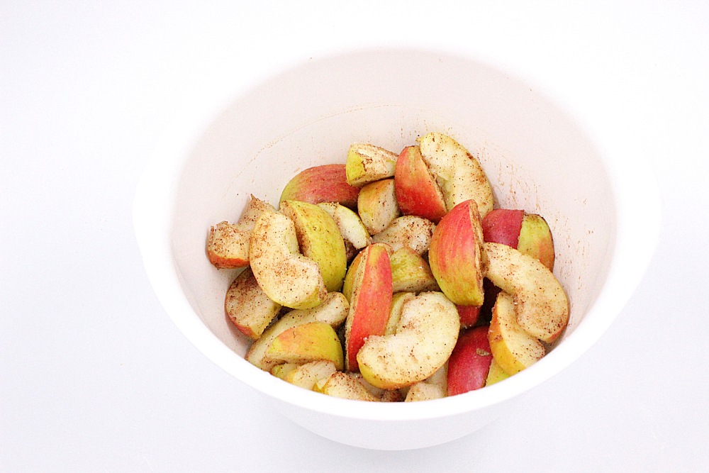 У яблок вырезать сердцевину, нарезать дольками, присыпать сахаром, корицей и хорошо перемешать.