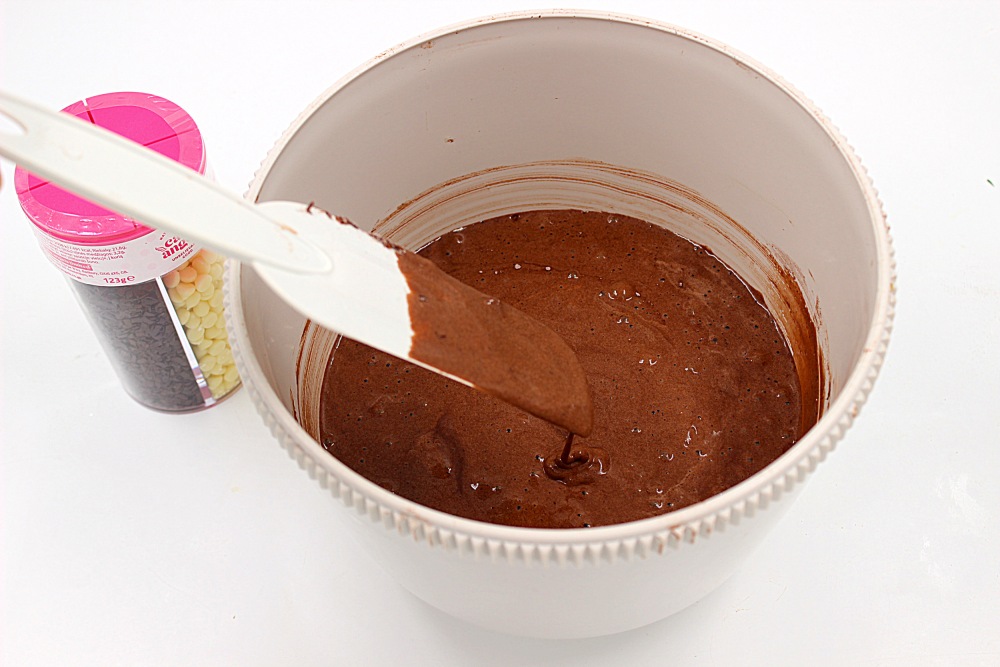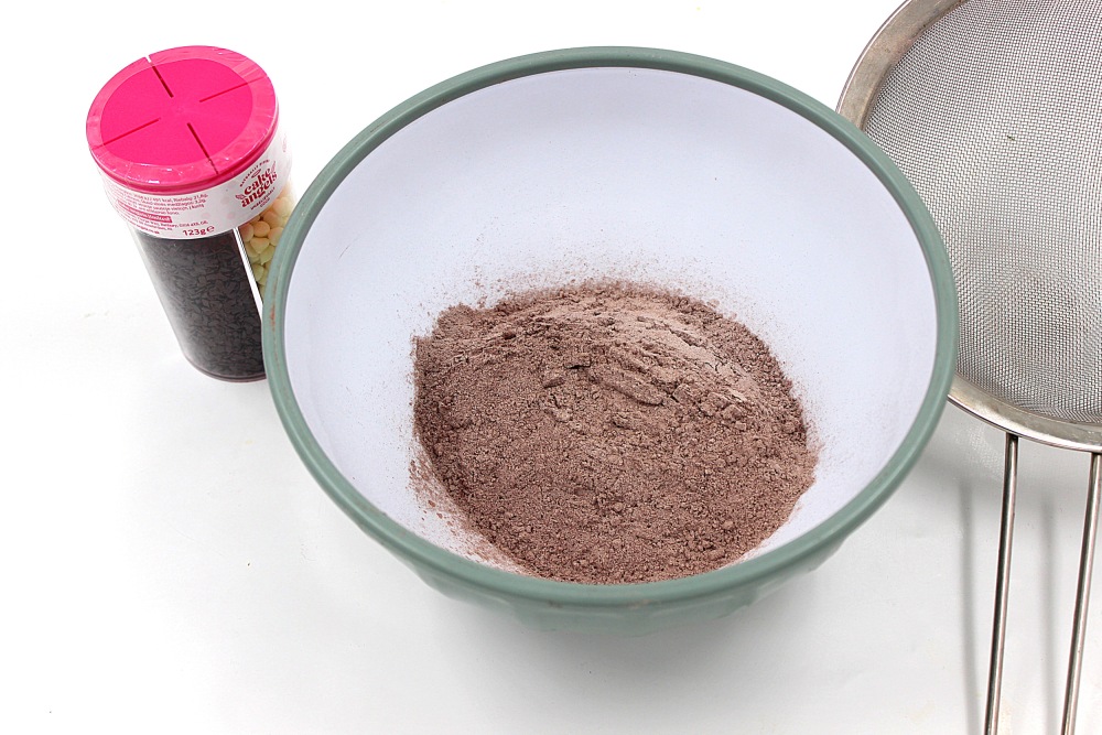 Два раза просеять какао-порошок с мукой и разрыхлителем.