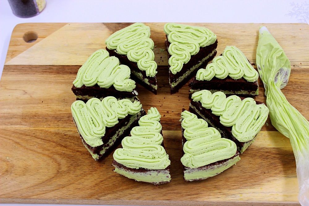 Нарезать бисквит на треугольники, а крем поместить в кулинарный мешок с насадкой и покрыть пирожные плотным зигзагом.