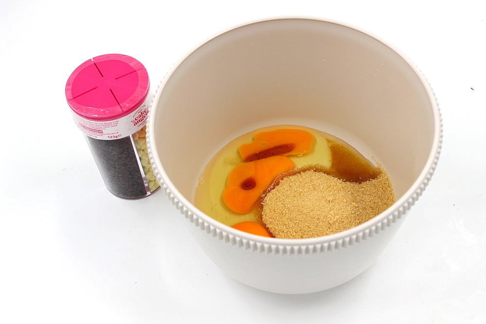 В миску вбить 2 яйца, добавить сахар, щепотку соли, ванильную эссенцию. Поставить взбивать.