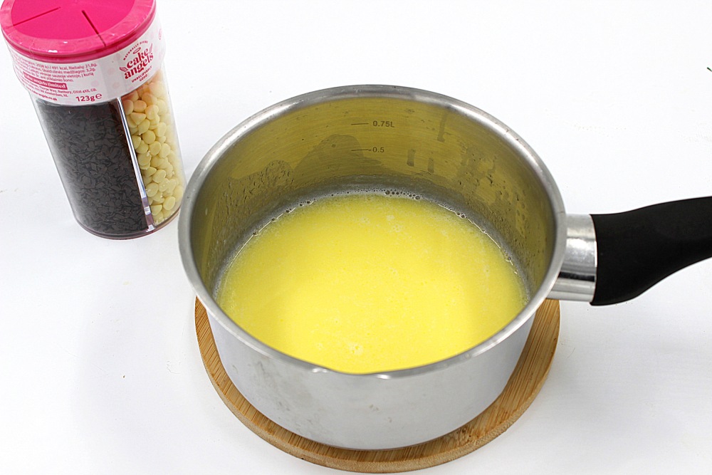 Параллельно в сотейнике довести почти до кипения молоко со сливочным маслом.