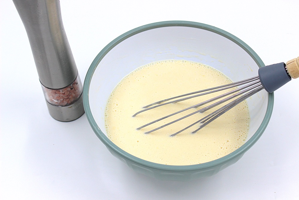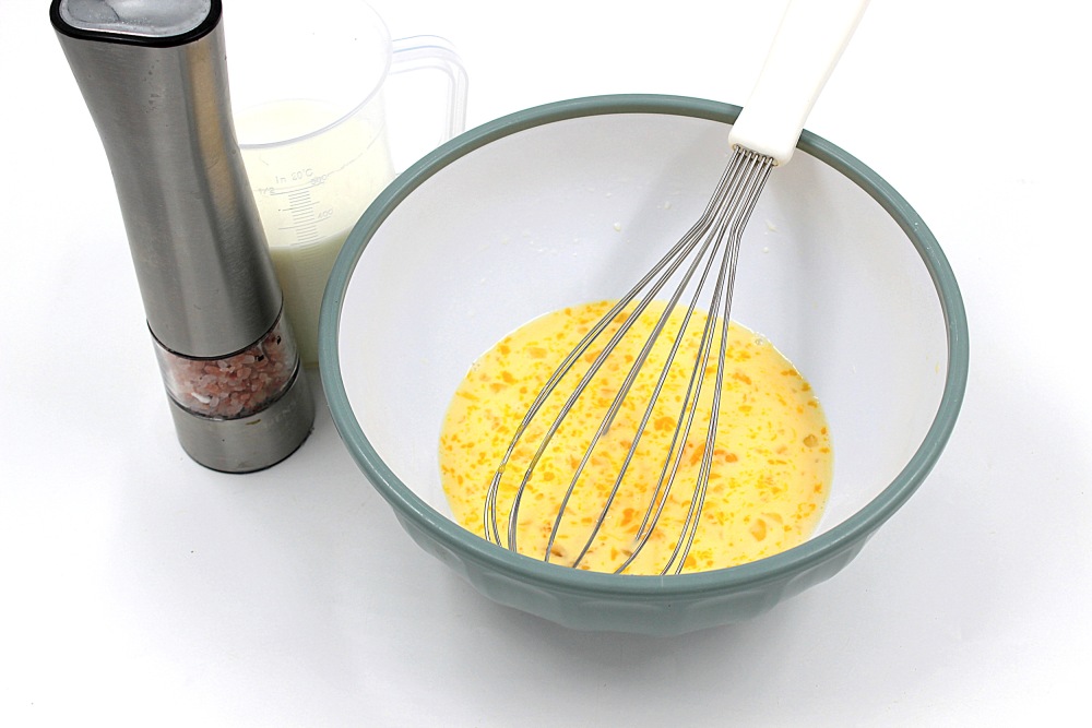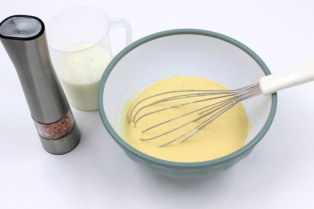 В миске взболтать яйца с солью, сахаром и половиной молока.