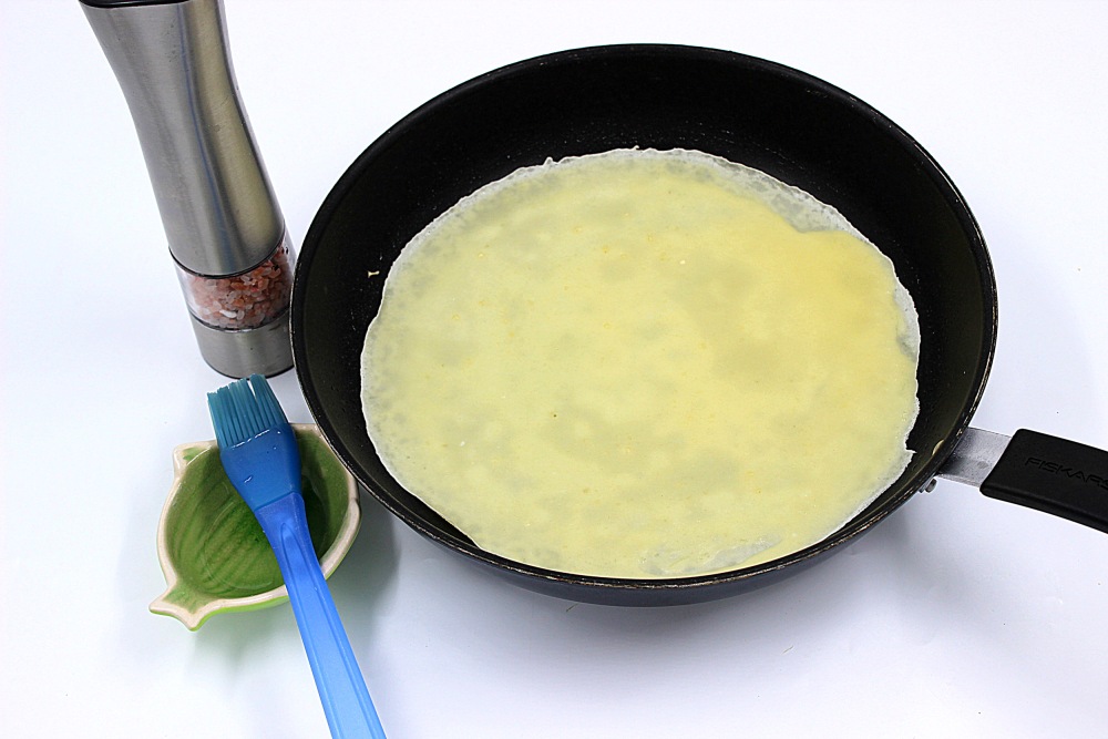 Раскалить сковороду, смазать маслом и вылить немного теста, поворачивая кругом сковороду, что бы оно равномерно и тонко растеклось по поверхности.