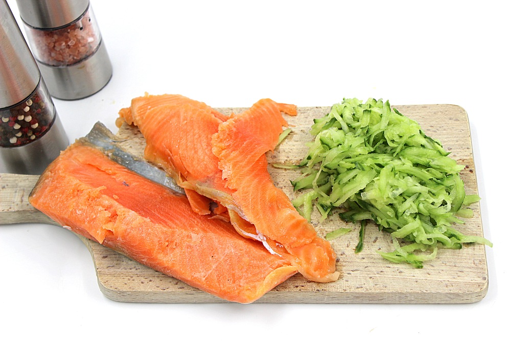 Рыбу нарезать тонкими слайсами(примерно 2 мм), а огурцы натереть на тёрке и слегка отжать.
