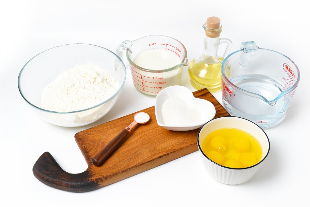 Подготовить ингредиенты комнатной температуры: муку, молоко, воду, яйца, растительное масло, соль, сахар.