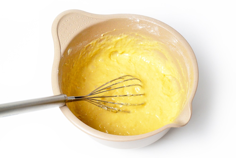 Влить 200 мл молока и добавить всю муку, тщательно размешать венчиком. Получается густое тесто, которое сплошной лентой стекает с венчика.