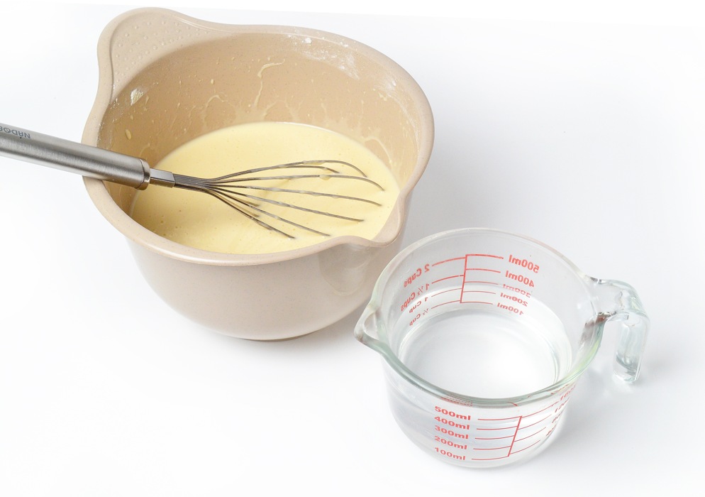 Тонкой струйкой влить кипяток, постоянно помешивая тесто венчиком, чтобы мука равномерно заваривалась.