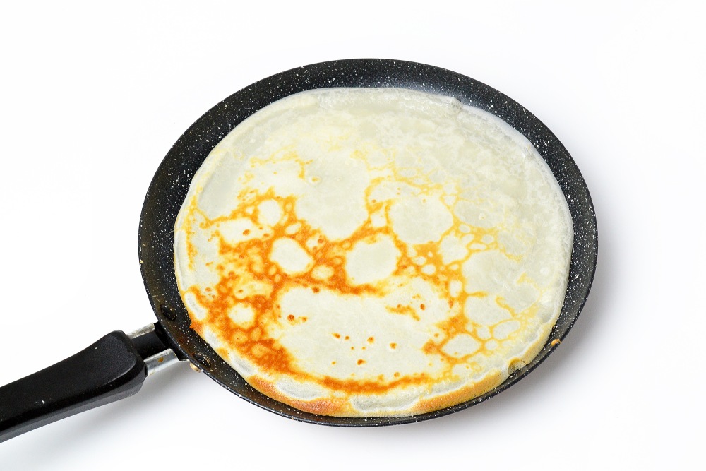 - Не спешите переворачивать блинчики, они должны подрумяниться снизу. Ориентируйтесь на цвет краев, хотя бы с 1 стороны они должны начать подрумяниваться.
