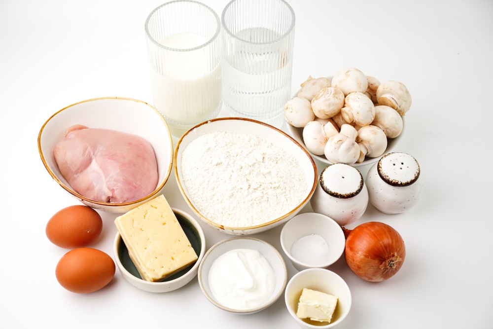 Подготовить ингредиенты для блинов с курицей, грибами и сыром. Достать все продукты заранее, чтобы они были комнатной температуры, так тесто получится более однородным. Куриное филе проверить на наличие прожилок, грибы выбрать плотные и без тёмных пятен. Сыр взять такой, который хорошо плавится, тогда начинка получится сочной и тянущейся.