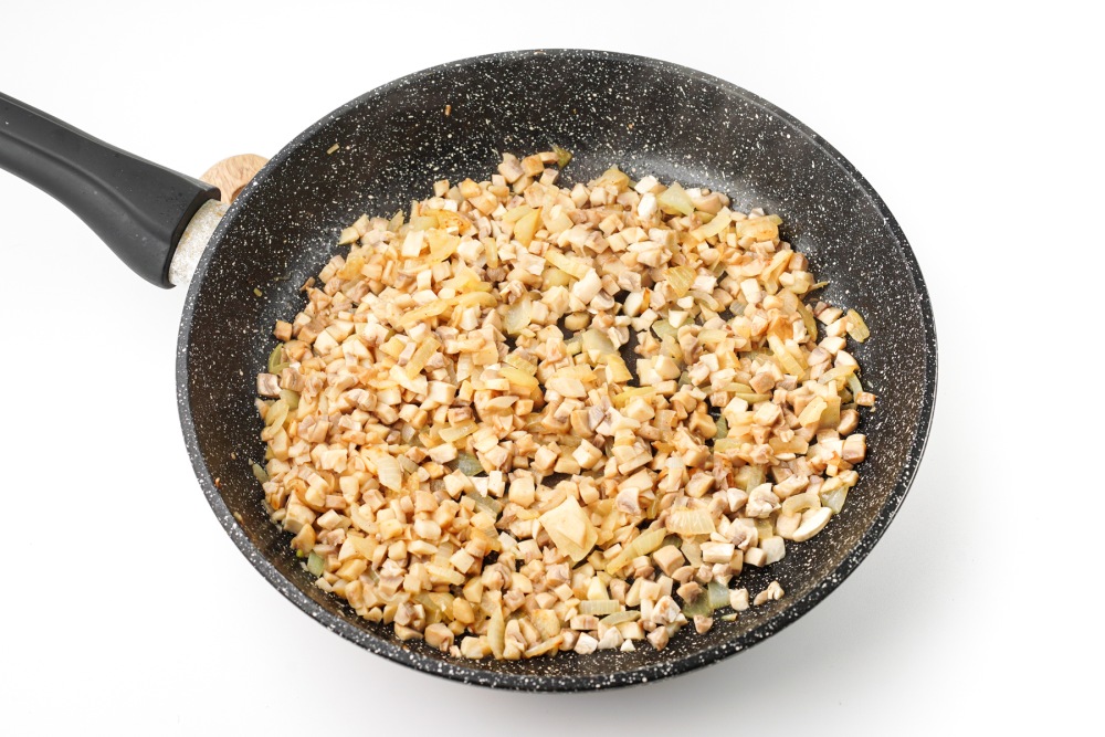Добавить грибы к луку. Обжаривать, пока не выпарится лишняя влага и грибы не станут мягкими и ароматными, примерно 7-10 минут.