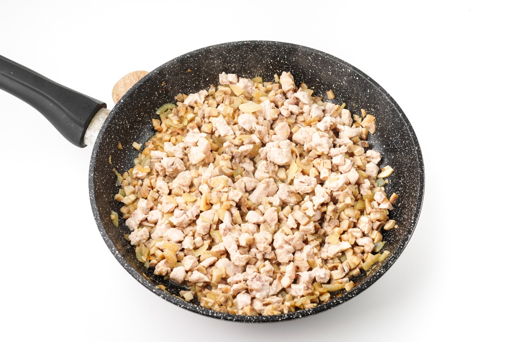 Добавить курицу в сковороду, посолить, поперчить. Готовить около 10 минут.