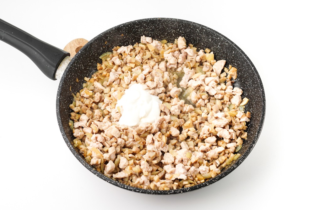 За 2 минуты до готовности добавить сметану, хорошо перемешать и тушить все вместе. Сметана должна быть жирной, чтобы начинка не была слишком жидкой. Сметана даст сочности.
