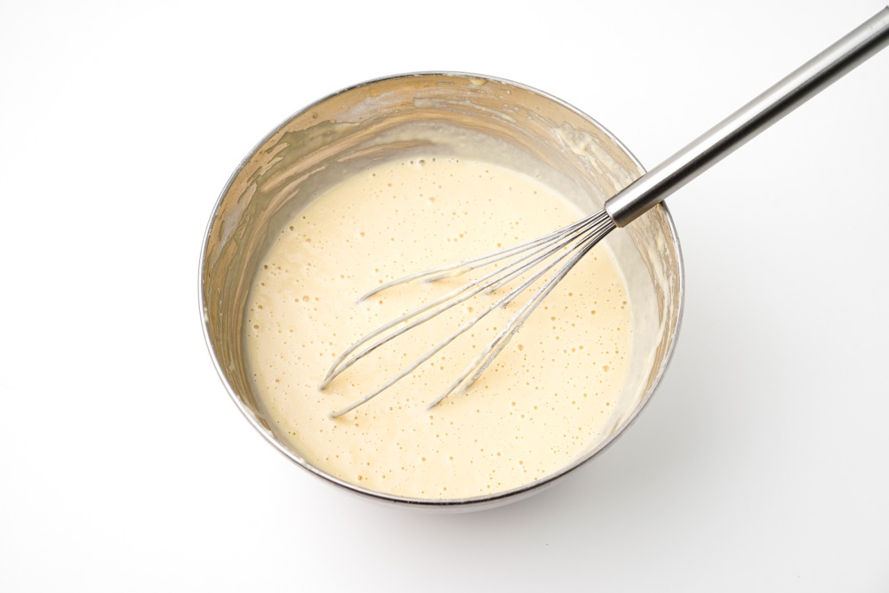 Тонкой струйкой влить кипяток. Постоянно помешивать венчиком, не останавливаясь ни на секунду. Это важно, чтобы яйца не свернулись от горячей воды. Кипяток сделает тесто более эластичным, благодаря чему блины не будут рваться при жарке и заворачивании.