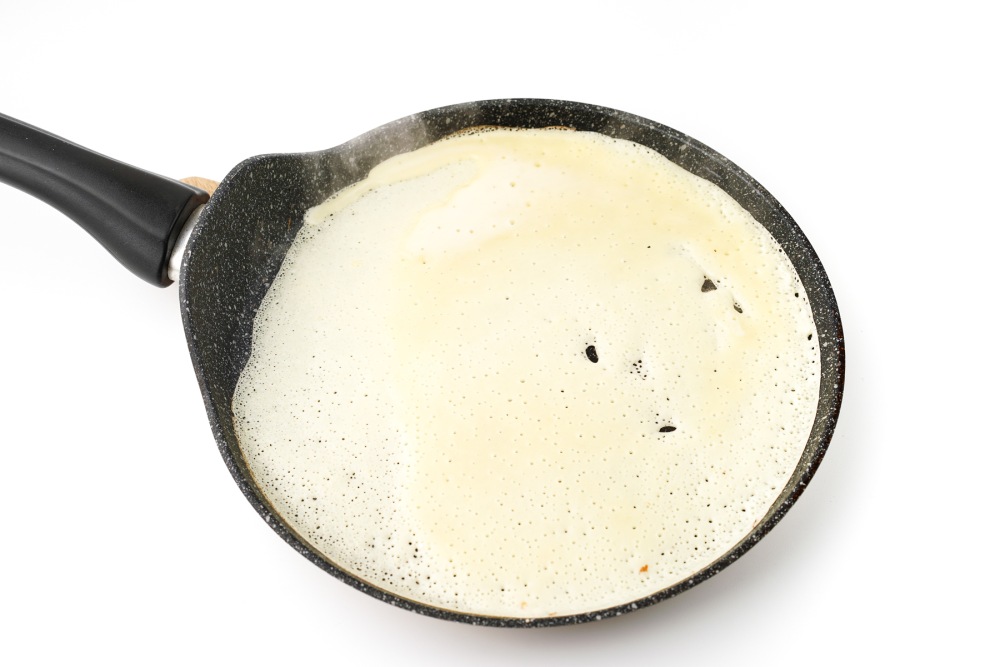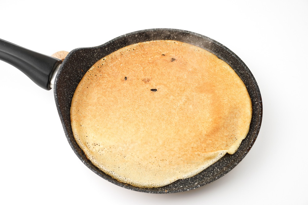 Поставить сковороду на средний огонь и дать ей хорошо прогреться. Перед первым блином слегка смазать поверхность маслом с помощью кисточки или салфетки. Вылить половник теста в центр и наклонять сковороду круговыми движениями, распределяя тесто тонким слоем.