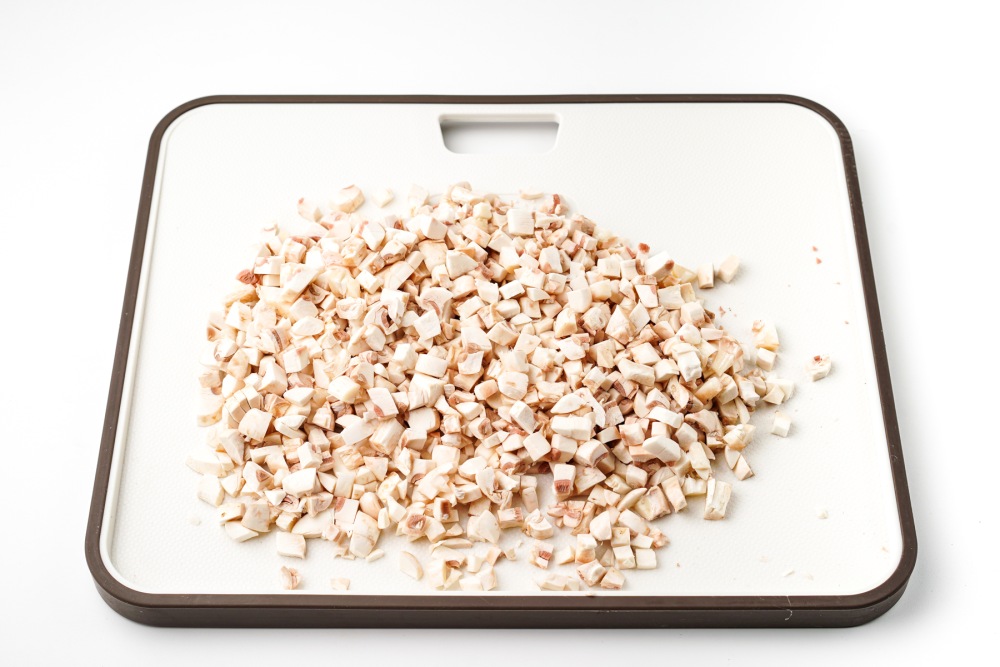 Грибы промыть и обсушить. Нарезать мелкими кубиками, чтобы начинка была однородной и удобно заворачивалась в блин.